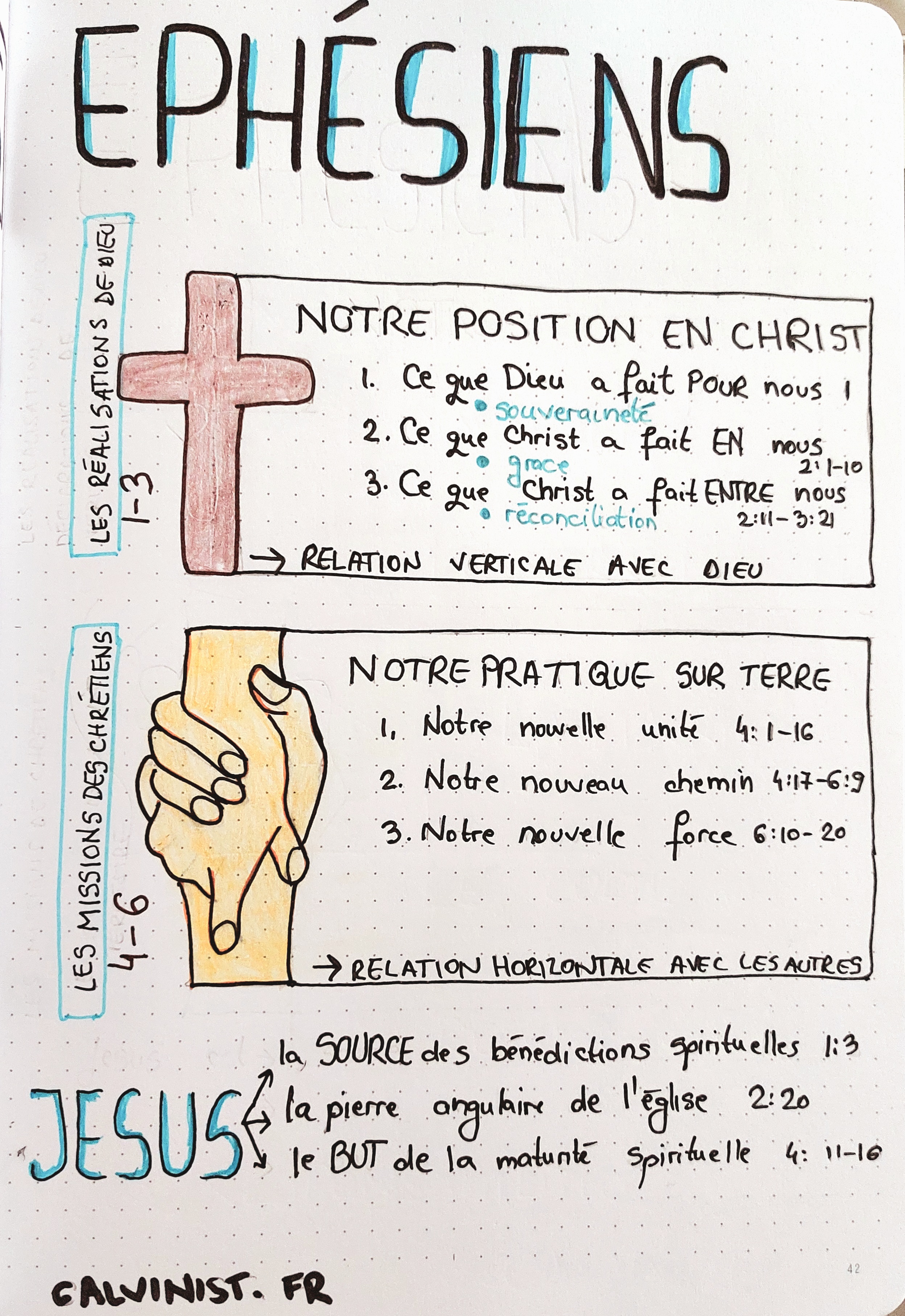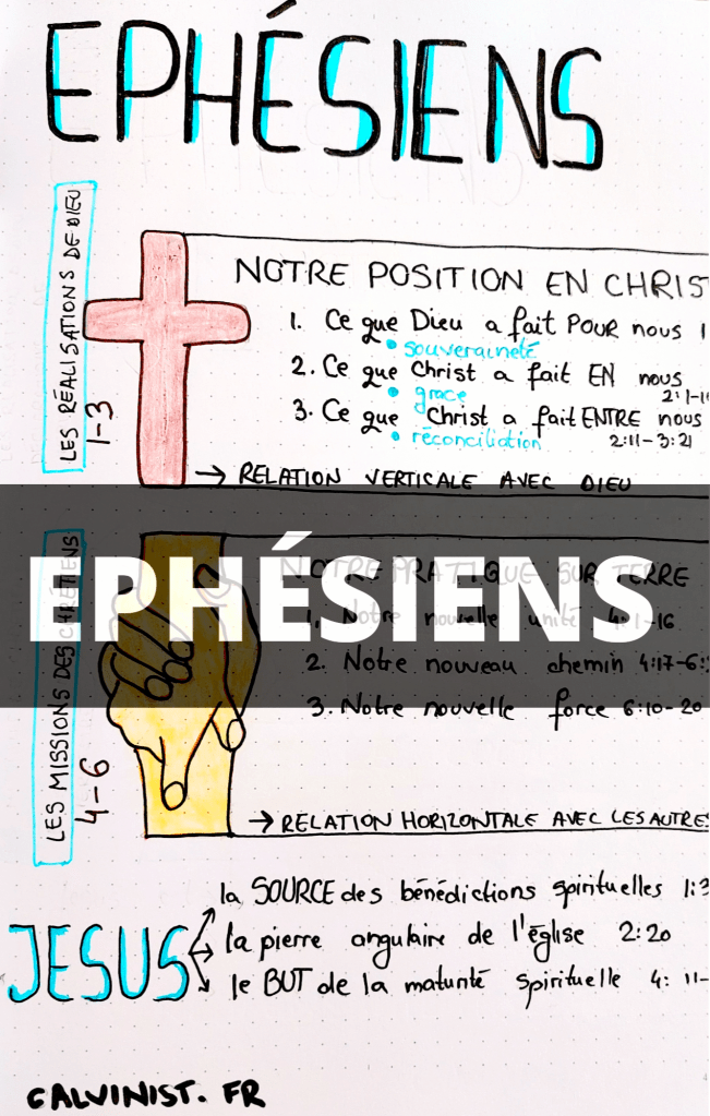 - Le but de Dieu pour l’Église(1:3-3:13): la prédestination et le salut en Jésus-Christ, les ressources en Christ, la nouvelle vie en Jésus et l’unité en Jésus-Christ.
